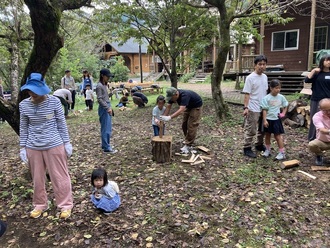 今回は、11家族32名と多くのみなさまにご参加いただきました。ご家族で協力して割った薪を使って火起こし体験。初めてマッチを使うお子様、久々に使うお父さんお母さんの様子が見られました。心配された天気も当日は季節外れの暑さで、普段できない体験を存分に楽しめ、笑顔があふれていました♪